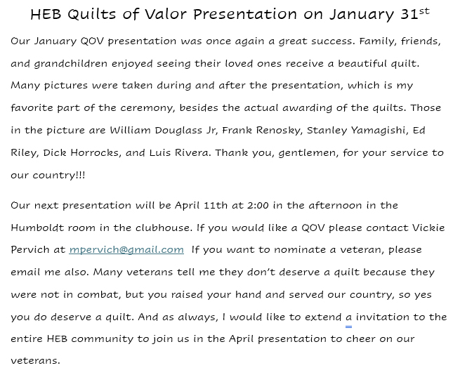 The Veterans’ Coffee will be at 0900 on 20 February in the clubhouse. Veterans, Veteran Spouses and Surviving Spouses are all welcome. Steel pots and flak jackets are optional.