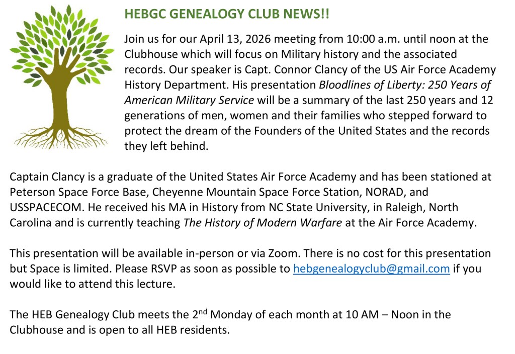 The HEB Parkinson’s support group meets the third Thursday of each month in the Club House. Please pass the word that this group is for anyone with Parkinson’s, any and all care partners and support friends and family. Our goal is to reach out to the community to help all of the above to better understand and support our Parkinson’s community.