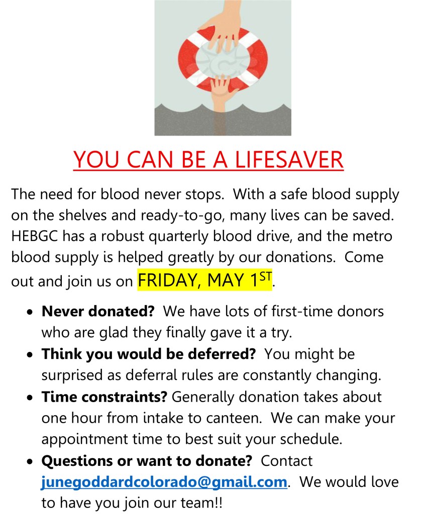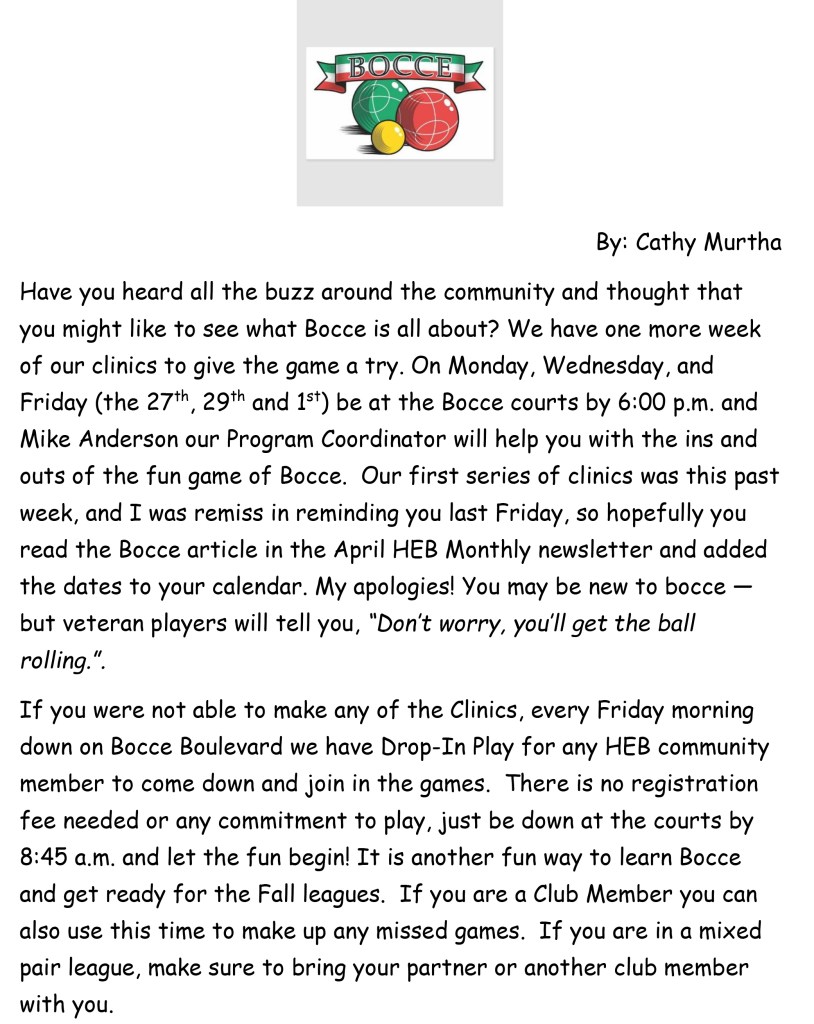 The HEB Busy Bloomers Garden Club will be having their spring fundraiser selling gift cards to a local nursery ending Thursday, April 30th at noon. The cards make great gifts for birthdays, anniversaries, and holidays. The signup sheet and instructions will be at the Welcome Desk at the clubhouse. Anyone can purchase the gift cards, not just members of the garden club. They come in denominations of $25 and you can purchase as many as you’d like. Pay with checks only please, made out to Busy Bloomers Garden Club. Distribution of the cards will start during the week of May 4th. Thank you for supporting our wonderful Busy Bloomers Garden Club at HEB.
