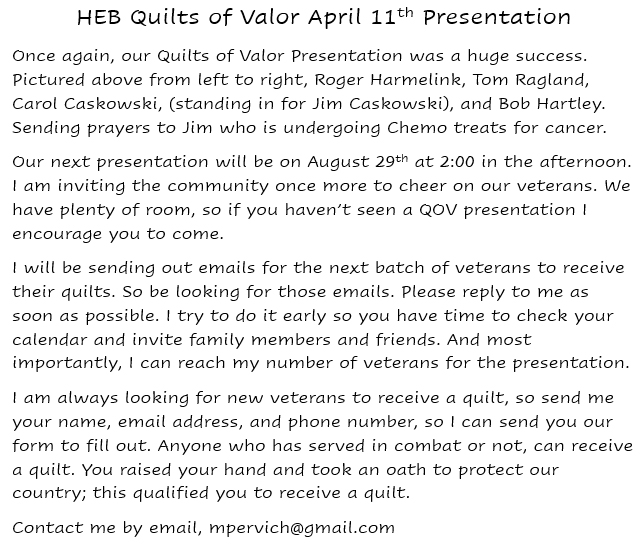 The Veterans’ Coffee will be at 0900 on 15 May in the clubhouse. Veterans, Veteran Spouses and Surviving Spouses are all welcome. Steel pots and flak jackets are optional.